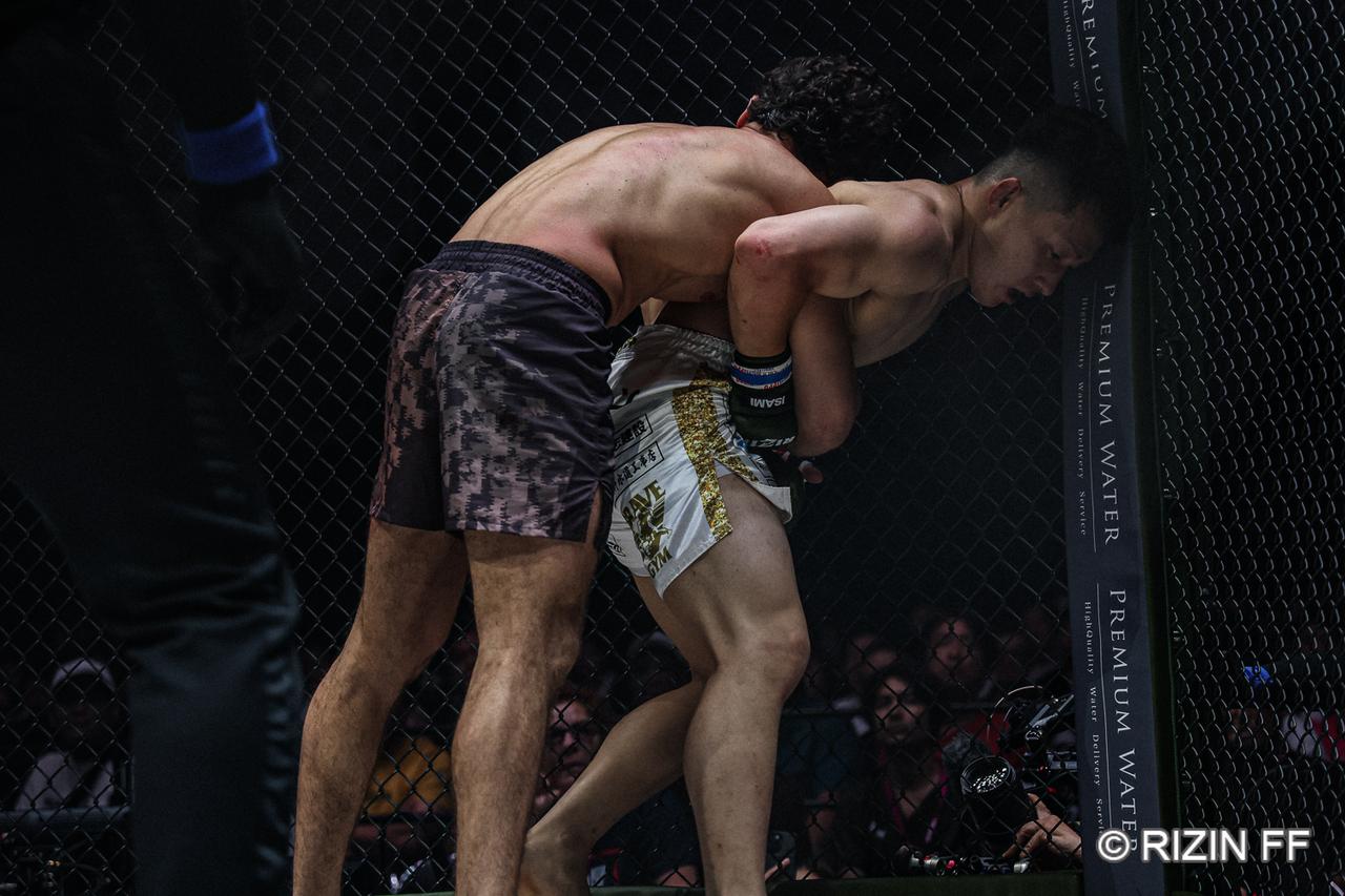 ケラモフはここも低空タックルで入り、木村が受け止めると金網まで押し込んでいく。だが、ここは木村が体を離す。タックルでケラモフが組みついてコントロールし終了となる。