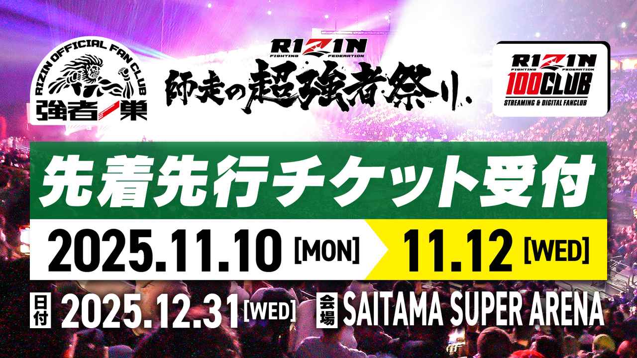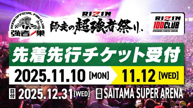 12月31日(水)さいたまスーパーアリーナで行われるRIZIN師走の超強者祭りのRIZIN FFオフィシャルファンクラブサイト『強者ノ巣』会員、またRIZIN 100 CLUBの先着先行受付が、11月10日(月)12:00よりスタートするぞ!