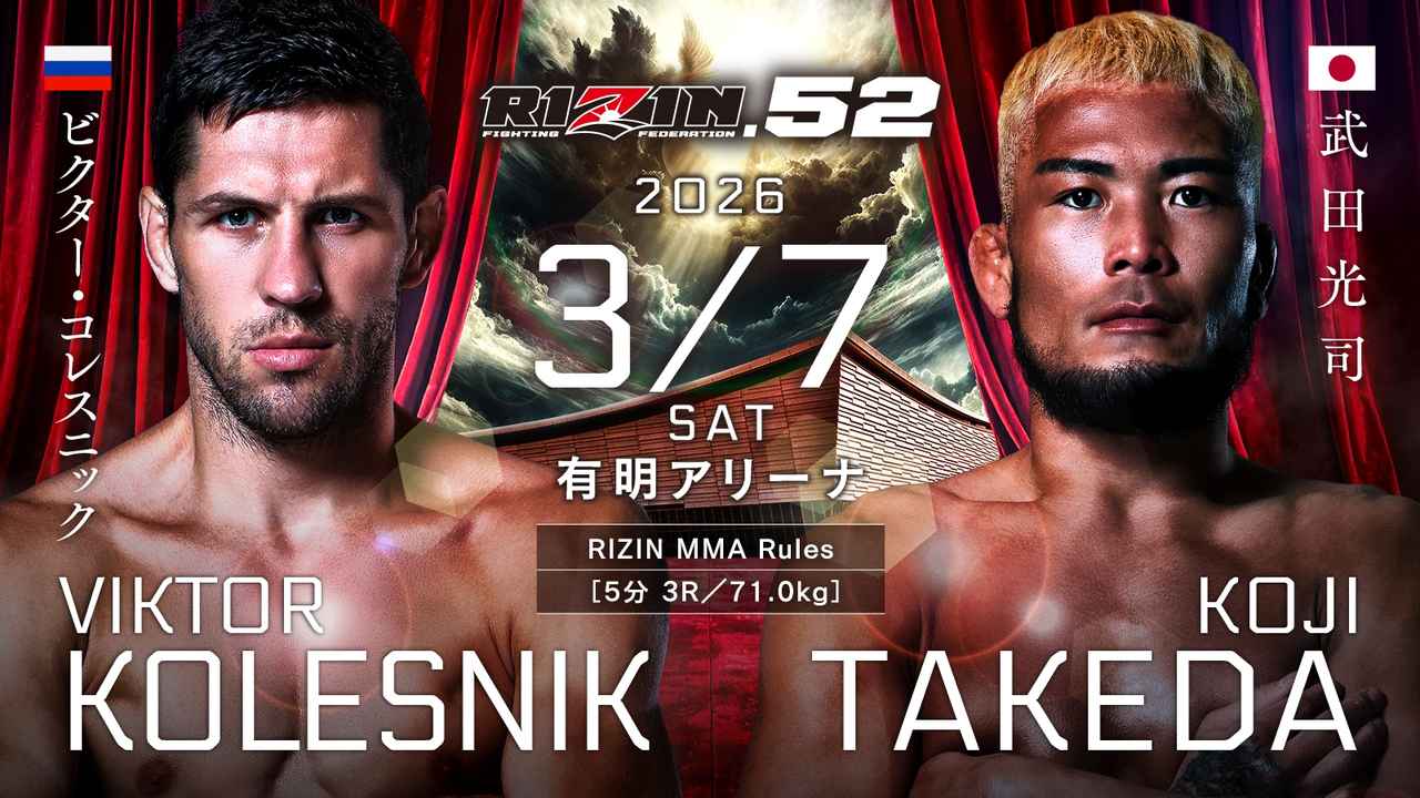 2026年3月7日(土)有明アリーナで開催される「RIZIN.52」の第9試合/ビクター・コレスニック vs. 相本宗輝は、相本が交通事故に遭い今大会を欠場することとなりました。