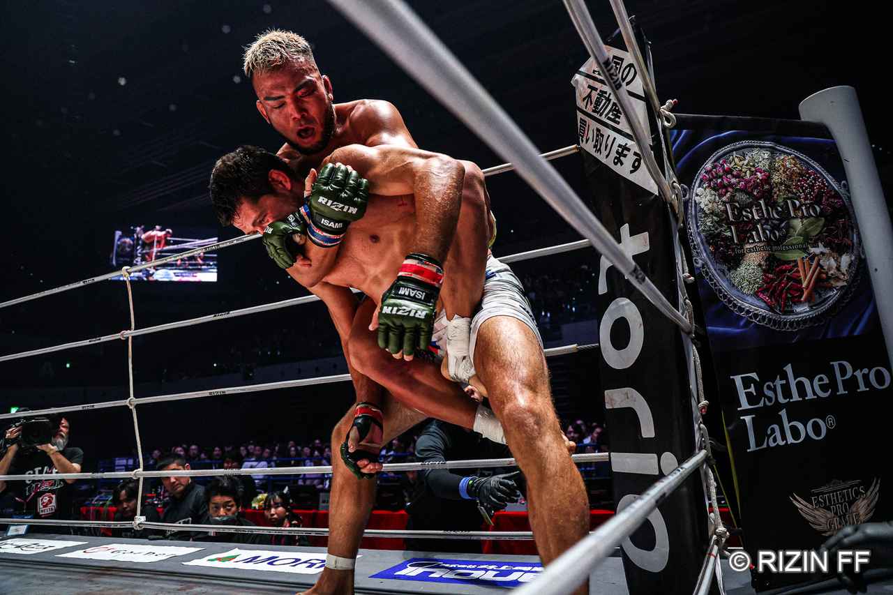 コレスニックにインローに崩れた武田だがそこからタックルで入り、そのままコーナーに押し込む。しかしコレスニックはコーナーから逃れ、ヒジ打ちを見舞って武田を流血させる。武田はしかし密着を緩めずついていき、コレスニックを横に振って崩しバックに回るが、コレスニックはオンブ状態から武田を振り払う。しかし武田はすぐに再び密着し、コレスニックをコーナーに張りつける。