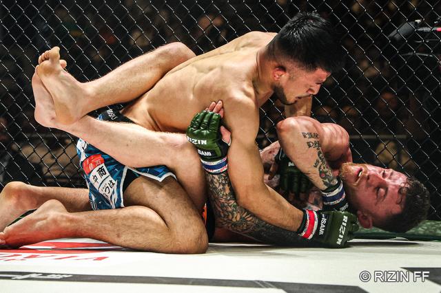 摩嶋はサウスポーからタックルで入り、ギャラガーはこれを受け止め右腕でギロチンチョーク。顔が紅潮した摩嶋だが頭を引き抜き、ギャラガーをハーフで抑える。下からギャラガーが抗戦してくるが、摩嶋が足を抜きマウントポジションに。ギャラガーがハーフに戻しても摩嶋はプレッシャーを弱めない。ギャラガーは足関に活路を求めるが、摩嶋はすぐ抑え込みに戻ってギャラガーにヒジを浴びせる。