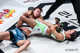身長で上回る海咲に、NOELは開始すぐに組みつき金網に押し込む。しかし海咲はNOELの顔を遠ざけヒジを見舞う。NOELは自ら離れて打撃戦に戻り、そこから2度目のタックルで再び押し込み、海咲をテイクダウン。しかし海咲は背中をマットに着けず、金網を背にしながら立ち上がってスタンドに戻る。組み合いからNOELが引き込むように腕十字を狙いつつ下に。しかしこれは海咲が腕...